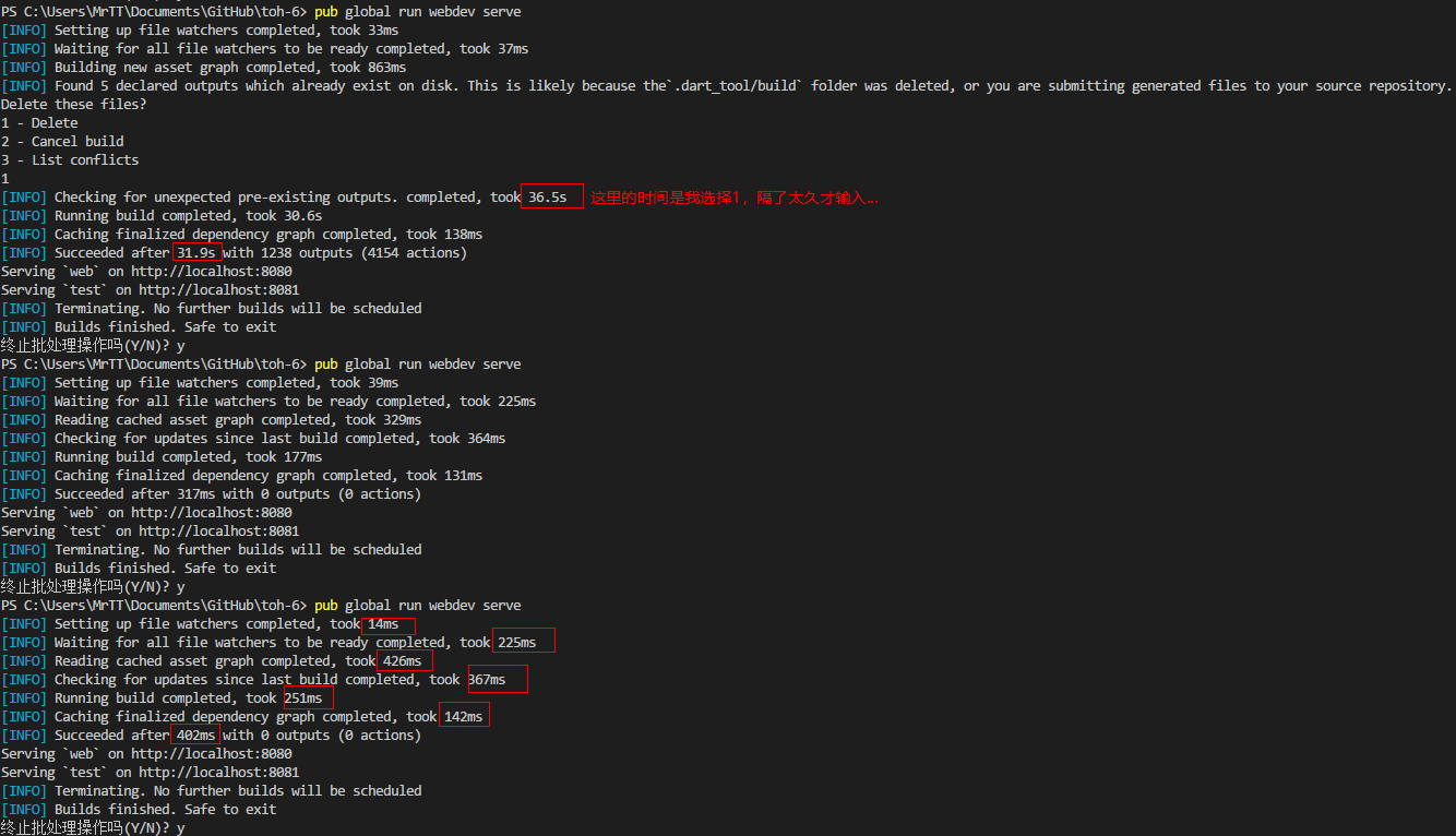 dart仅在在首次会编译运行所需的文件,因此,它表现为首次编译时间十分长(约33s),而之后的每次,都仅需较短的时间(约2-3s)